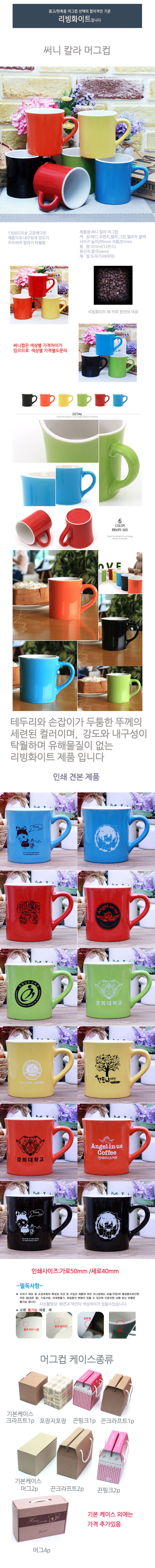 | 기타사항 | 컵색상별로 금액이 다름 머그 + 기본케이스 + 실크1도단면 포함 기본수량 이하인쇄시 기본인쇄비 별도문의 전사인쇄 별도문의 선물포장,끈케이스 1p,2p,4p 가능-별도문의 |