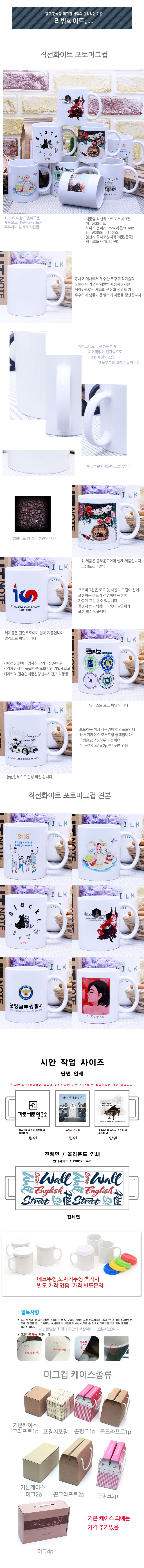 | 기타사항 | 머그 + 기본케이스 + 포토인쇄 포함 100개이하인쇄시 기본인쇄비 별도문의 양면인쇄.올라운드인쇄,개별인쇄 비용 별도문의 선물포장,끈케이스 1p,2p,4p 가능-별도문의 |