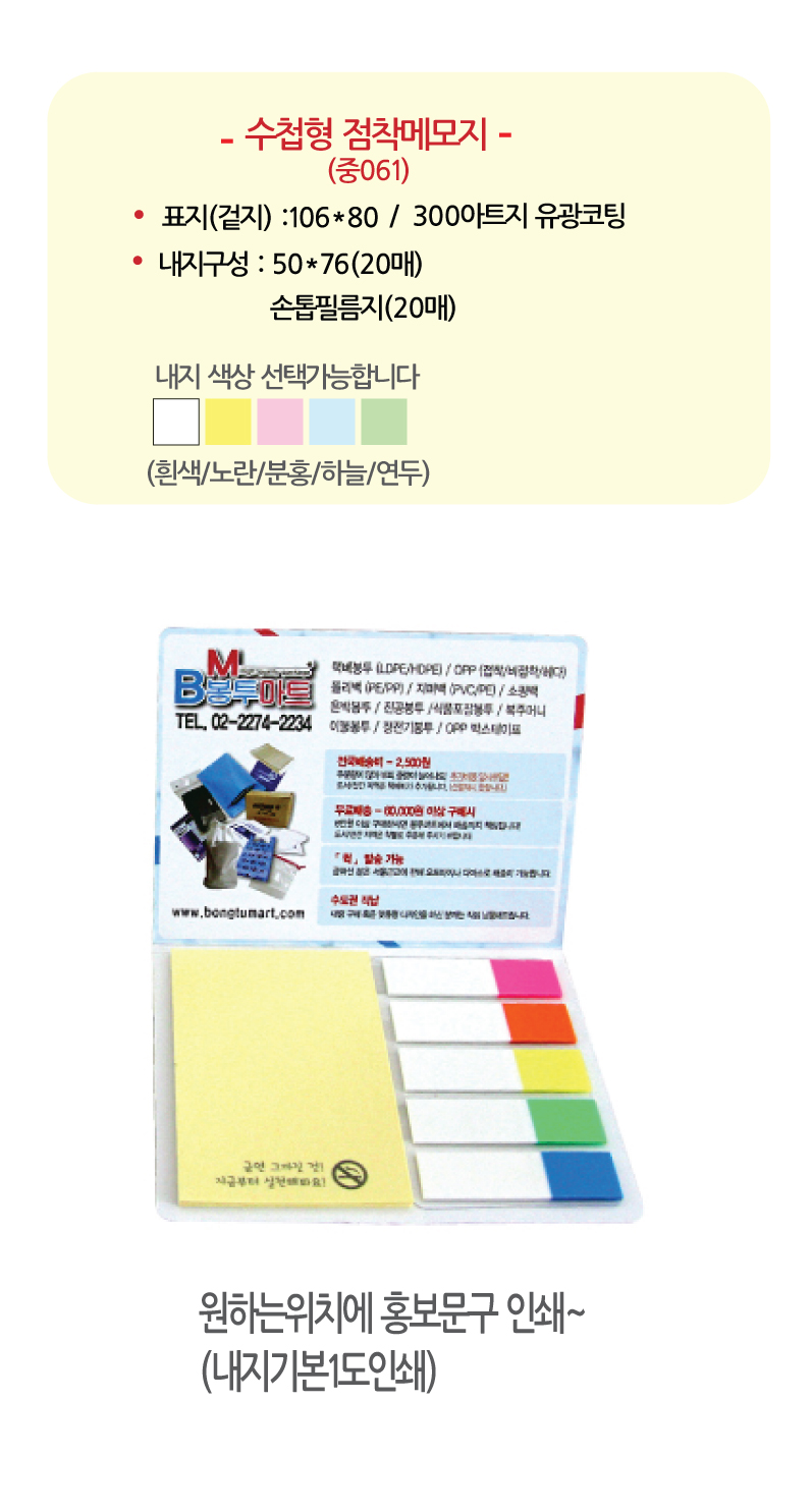 | 색상 | 포스트잇색상 : 흰색/노란/분홍/연두/하늘 |