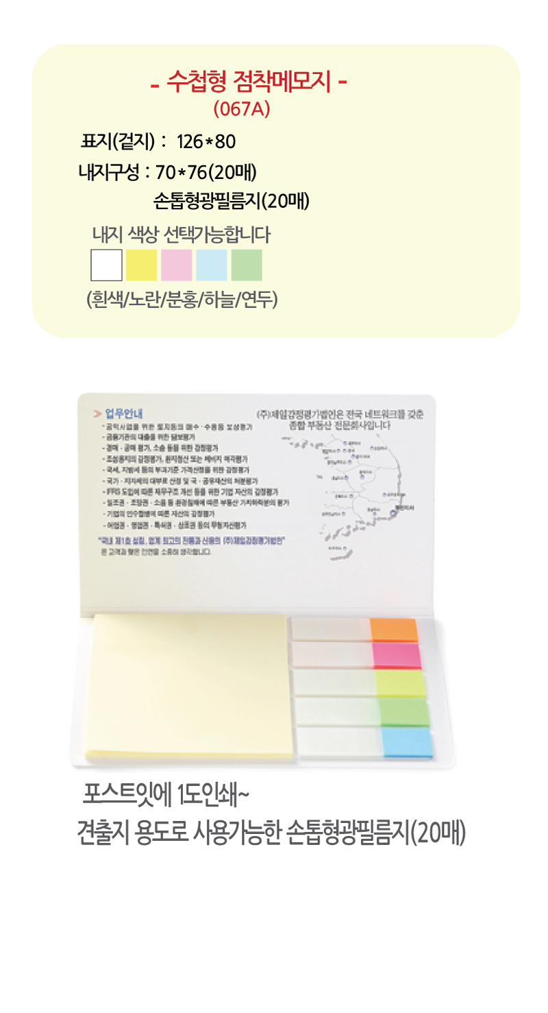 | 색상 | 포스트잇색상 : 흰색/노란/분홍/연두/하늘 |