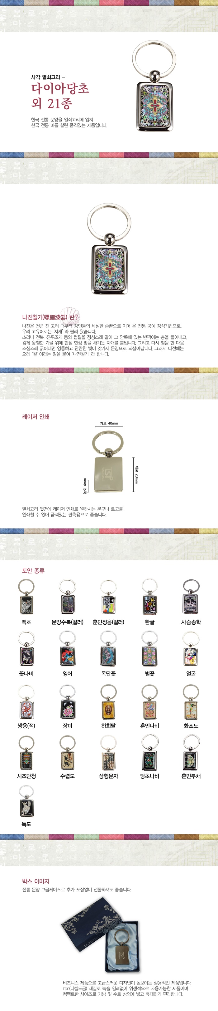 | 색상 | 다이아당초,백호,문양수복,훈민정음,한글,사슴송학,꽃나비,잉어,목단꽃,별꽃,얼굴,쌍용(적),장미,하회탈,훈민나비,화조도,시조단청,수렵도,상형문자,당초나비,훈민부채,독도 |