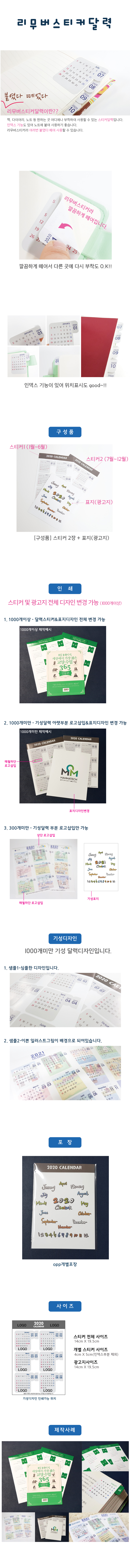 | 기타사항 | 붙였다 떼었다 할수 있는 스티커달력입니다. 1000개부터 스티커디자인 변경 가능하며, 1000개미만은 광고지 ㅣ변경 가능합니다. |