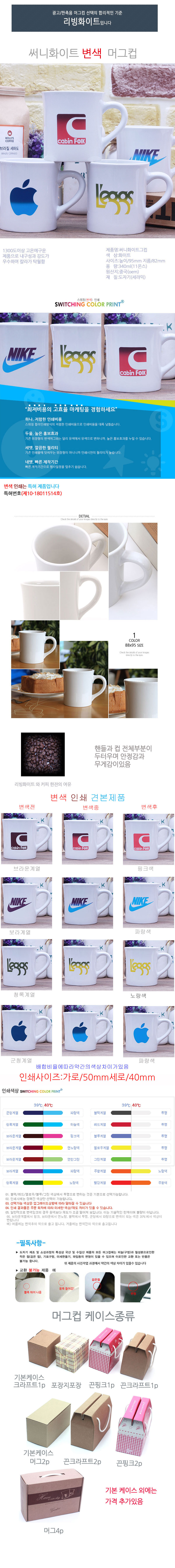 | 기타사항 | 머그 + 기본케이스 + 변색실크1도단면 포함 100개이하인쇄시 기본인쇄비 별도문의 선물포장,끈케이스 1p,2p,4p 가능-별도문의 |