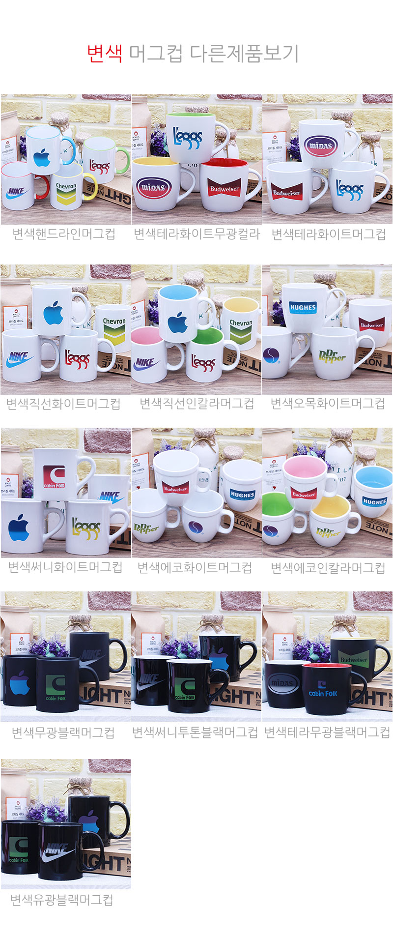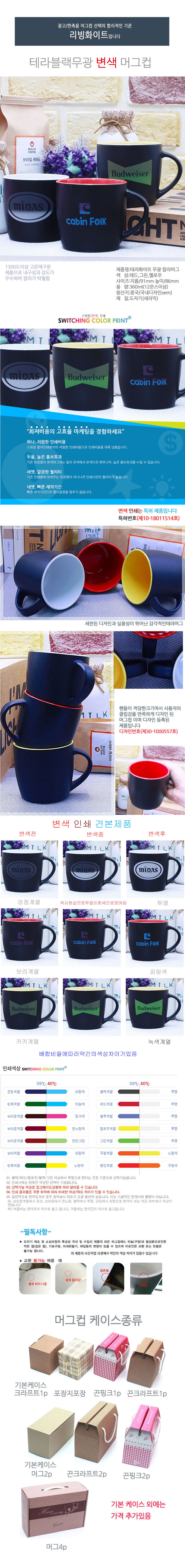 | 기타사항 | 기본 : 머그 + 기본케이스 + 변색실크 포함 100개이하인쇄시 기본인쇄비 별도문의 선물포장,끈케이스 1p,2p,4p 가능-별도문의 |