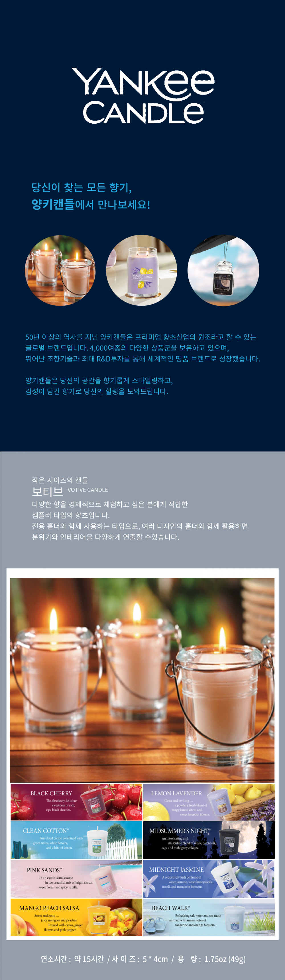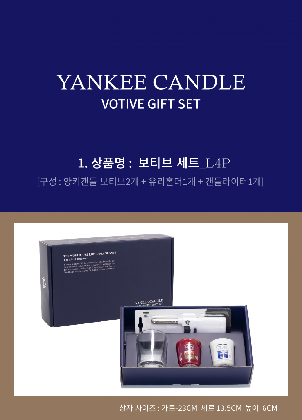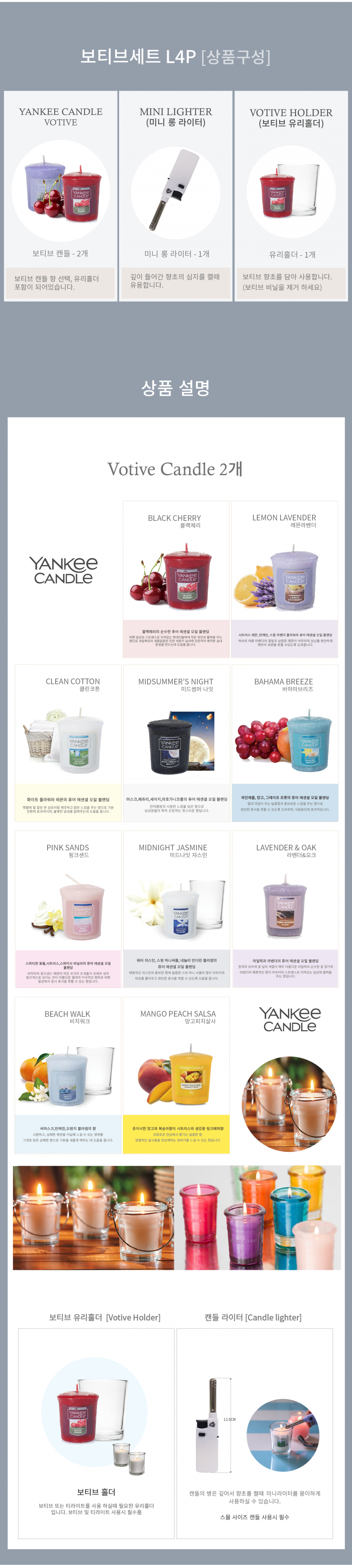 | 제품구성 | 양키캔들 보티브2개,유리홀더1개,라이터1개,상자포함 |