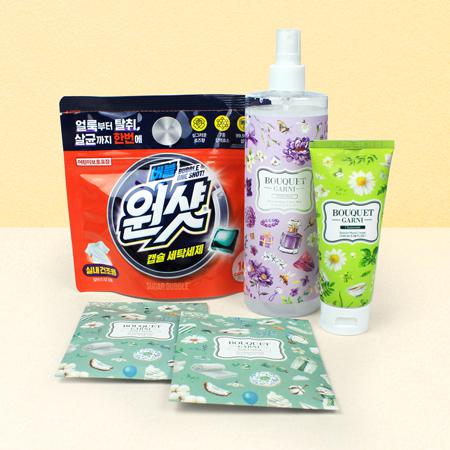| 제품구성 | 슈가버블 버블원샷 캡슐세제 10매입 + 부케가르니 섬유향수 + 부케가르니 캐모마일 핸드크림 100g + 부케가르니 옷장방향제(샤쉐) 2개 + 끈케이스 |
