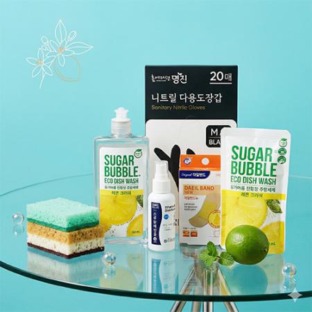 | 제품구성 | 슈가버블 주방세제 280ml + 리필 280ml + 니트릴장갑 + 떡수세미2개 + 대일밴드뉴 8매입 + 소독용에탄올 + 끈케이스 |