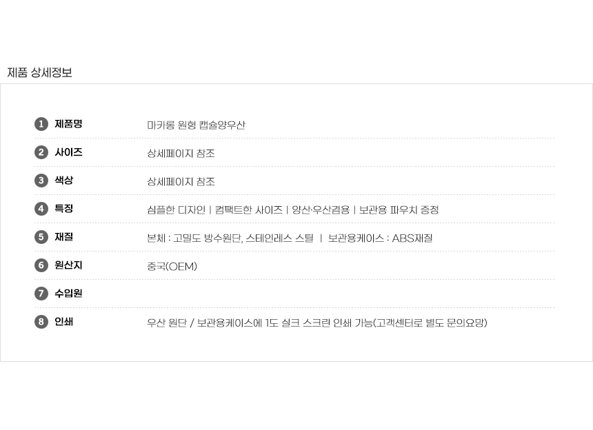 | 제품구성 | UV차단 원형캡슐우산 |