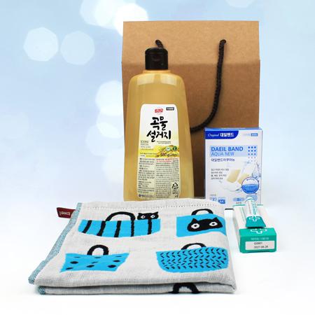 | 제품구성 | 주방필수품 애경 곡물설거지 주방세제 500ml + 대일밴드 아쿠아 방수밴드 오리지널 8매 대형4매 + 닥터스킨 상처연고 + 순면 캐릭터 주방타올 + 끈케이스 |
