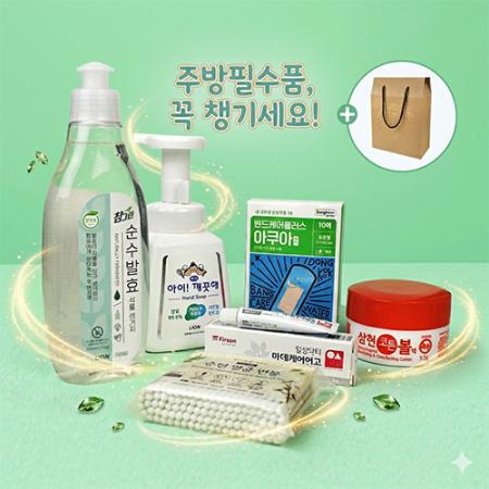 | 기타사항 | 참그린 주방세제 + 주방전용 아이깨끗해 핸드워시 + 알콜솜 코튼볼 소독제 + 마데케어 연고 + 동국제약 고탄력밴드 + 멸균면봉 + 끈케이스 케이스 이미지 변경 가능, 상세페이지 참조 (어려운이웃 복지사각 / 치매예방 / 금연홍보 / 슬기로운 안전생활) 스티커 제작 및 부착 별도문의 케이스 실크1도인쇄 별도문의 |